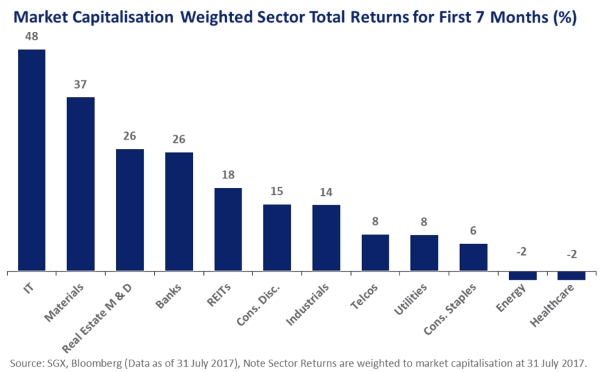 §  Information Technology ("IT") was Singapore's best performing Sector in July, with a 5.3% market capitalisation weighted total return. For the first seven months of 2017, the IT Sector's indicative return came to 47.7%.