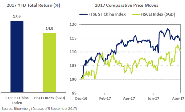 In the 2017 YTD, Singapore's FTSE ST China Index has generated a total return of 17.9%, compared to a 14.9% return for the H-share Index in SGD terms.