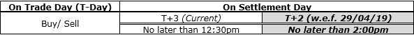 Please be informed that with effect from 29 April 2019, the trade settlement cycle for Bursa will be shortened from T+3 to T+2. The change is as stated below: