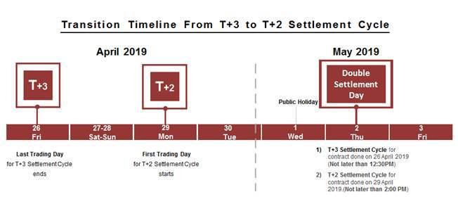 In accordance to this settlement cycle change, we wish to bring to your attention, the following timeline during the transition from T+3 to T+2, whereby 2 May 2019, is deemed as the Double Settlement Day. This is depicted below: