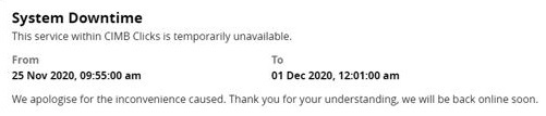 CIMB Clicks ePayment Services Under Maintenance from 25 Nov to 1 Dec 2020