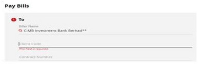 Pay Bills to “CIMB Investment Bank Berhad” with unlimited transaction limit and submit the payment proof to your respective Dealer’s Representatives (DRs). |