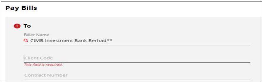 Pay Bills to “CIMB Investment Bank Berhad” with unlimited transaction limit and submit the payment proof to your respective Dealer’s Representatives (DRs). |