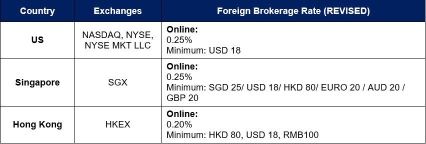 Please be informed that effective 17th January 2022, brokerage rates for Cross-Border trades (“CBT”) of US, Singapore and/or Hong Kong stock exchanges will be revised to the following rates: |
